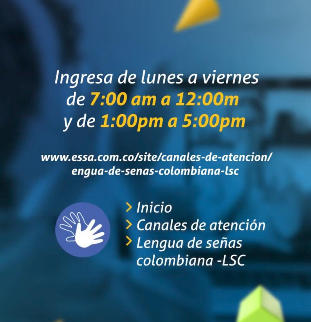 El acceso a estos servicios es sencillo, solo deben ingresar a la pagina web www.essa.com.co / botón servicio al cliente / canales de atención / lengua de señas colombiana, y allí un experto en lengua de señas atenderá los diferentes requerimientos de la comunidad sorda.