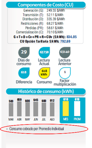 Esta opción que se acoge de acuerdo con lo estipulado por la ley 142, la cual indica en su Artículo 146 que cuando, sin acción u omisión, durante un periodo no sea posible medir los consumos, en este caso por la imposibilidad de hacer la toma de la lectura a los equipos de medida de los clientes, se podrá cobrar el consumo promedio de los últimos 6 meses. La aplicación de esta medida se puede validar en la factura del servicio de energía, como evidencia en la imagen adjunta.