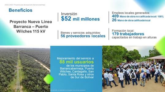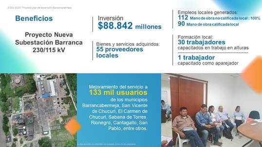 Las obras pertenecientes al Plan de Expansión del Sistema de Transmisión Regional de ESSA, alcanzan una inversión por el orden de los 140 mil 842 millones de pesos, 88 mil 842 millones de la subestación Barranca con tecnología GIS aislada en gas y la línea 115 kilovoltios Barrancabermeja – Puerto Wilches con 52 mil millones de pesos.