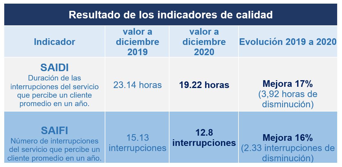 El Jefe del Área Gestión Operativa, Sergio Fernando Pérez Quitián, aseguró que la evolución de los indicadores de calidad en el año 2020 es muy satisfactoria puesto que se registra una mejora en el SAIDI de 4 horas, equivalente al 17%, llegando así a un valor de 19.22 horas, y en el SAIFI, la mejora fue de 2.5 interrupciones equivalente al 16%, llegando a un valor de 12.8 interrupciones.