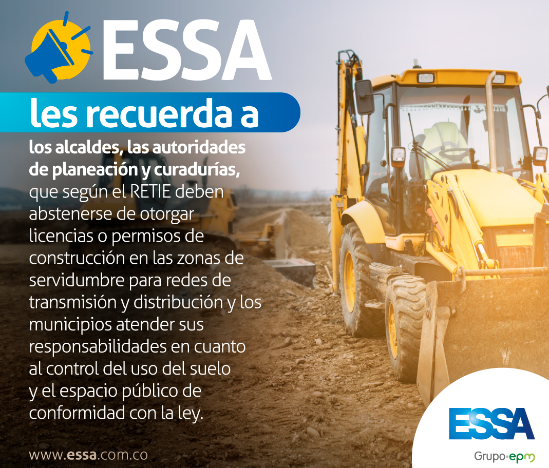 El subgerente de Conexiones encargado, Javier Alfonso Cabrera, señaló que el propósito es llegar con este mensaje a los alcaldes, secretarios de planeación, personeros y curadores de todos los municipios del área de influencia de ESSA para reiterarles la importancia de tener en cuenta las distancias de seguridad y todas las disposiciones establecidas al momento de otorgar las licencias de construcción.