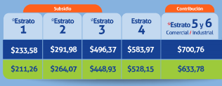 - Los estratos 1, 2 y 3 reciben en su tarifa de energía un subsidio de hasta el 60%, 50% y 15%, respectivamente; mientras que los estratos 5 y 6 realizan contribución del 20%.