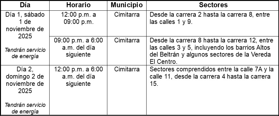 Es importante aclarar que la duración de esta programación depende directamente de las condiciones climáticas y del terreno. En este sentido, si el lunes 3 de noviembre la emergencia continúa, se repetirá la programación retomando los horarios del día uno; el martes 4 de noviembre corresponderá al día dos, y así sucesivamente, hasta restablecer el servicio con normalidad.