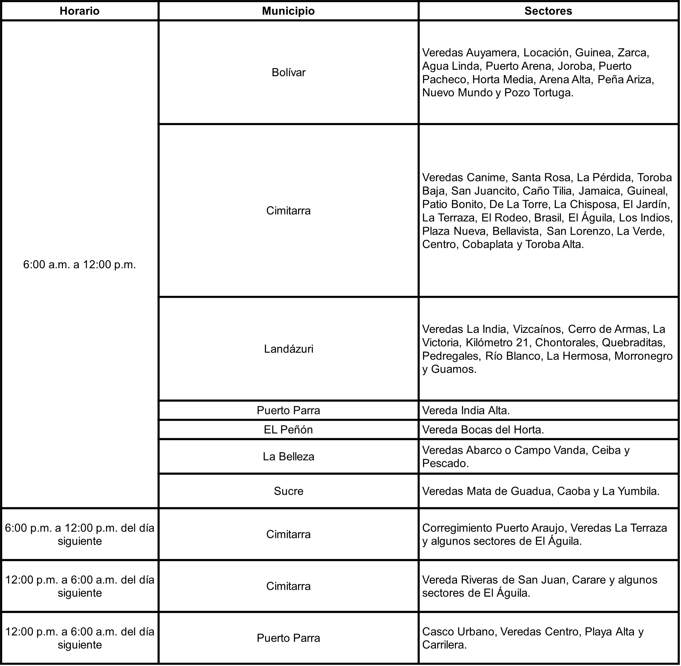 Municipio de Cimitarra: Barrios Nueva Cimitarra, La Pradera, Portal de Alejandría, Santo Domingo, Altos de La Paz, Bello Horizonte y Hospital Local, corregimiento Primavera y Puerto Araujo, veredas De La Torre, Los Morros, Caño Baúl, El Águila, Vuelta de Acuña, Riveras de San Juan, La Chisposa, Dos Hermanos, Puerto Olaya, Tierra Dentro, Campo Seco, San Juan y San Fernando.