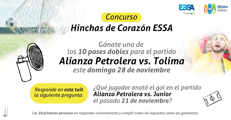 2. Vigencia: A partir del martes 23 de noviembre hasta el miércoles 24 de noviembre a las 11:59 p. m., ESSA Grupo EPM realizará el concurso que se describe a continuación, dirigido a sus seguidores en la red social Twitter. Los ganadores serán anunciados el día 25 de noviembre de 2021.