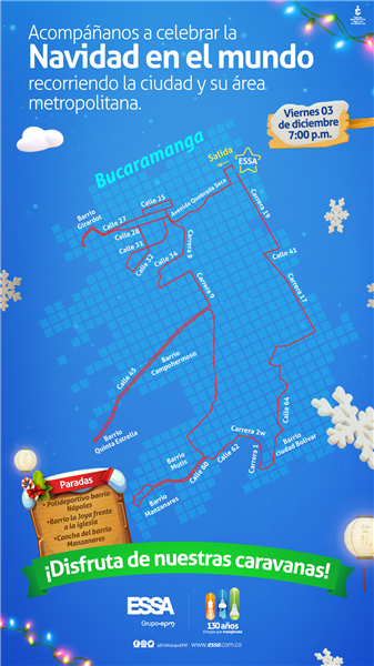 Salida desde ESSA Edificio Principal en el barrio Alarcón, baja por la Quebrada Seca a tomar la cra 15 vía al Norte, sigue por la vía principal hasta el barrio Café Madrid, sale por la avenida del Cemento rumbo a los Colorados, regresa directo a Bucaramanga.