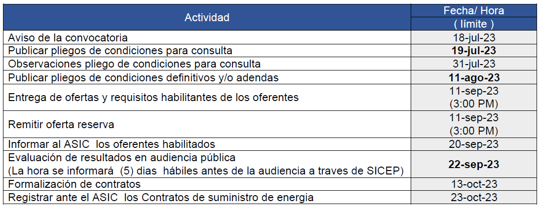 ESSA está interesada en recibir propuestas para el suministro de energía y potencia eléctrica requeridas para atender su mercado regulado, bajo la modalidad páguelo contratado, para el periodo del 10 de noviembre de 2023 al 31 de diciembre de 2036. Aplican todas las tecnologías incluidas FNCER.