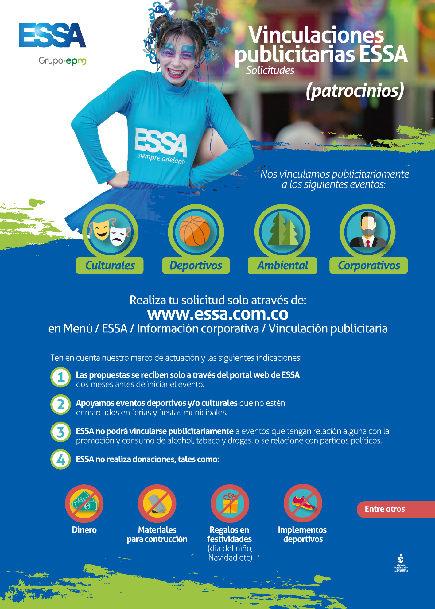 Realiza tu solicitud solo através de: www.essa.com.co en Menú / ESSA / Informacion corporativa / Vinculacion publicitaria