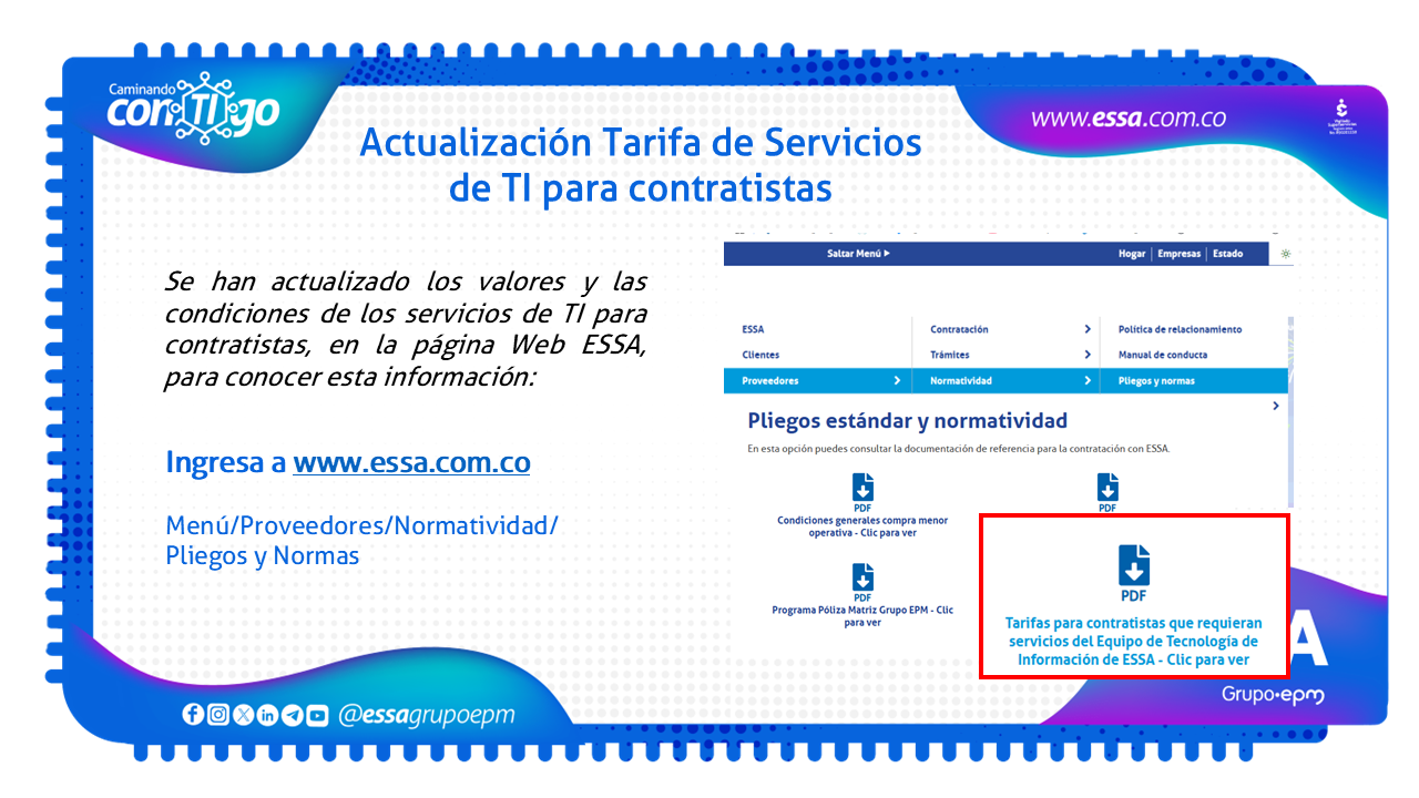 ESSA informa a todos sus contratistas y proveedores que se han actualizado las tarifas correspondientes a los servicios prestados por el equipo de Tecnología de Información (TI).