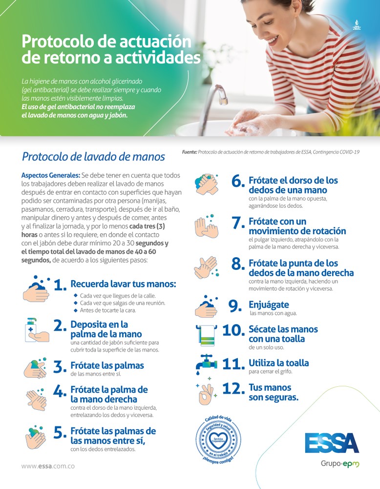 - Se deben realizar por parte del contratista los protocolos exigidos por el gobierno nacional, para lo cual deberá contar con el acompañamiento de la ARL respectiva, dichos protocolos deberán contemplar las medidas, directrices y procedimientos definidos en las Circulares Conjuntas, decretos y resoluciones que rijan la materia. ESSA podrá en cualquier momento, requerir al contratista para que soporte el cumplimiento de estas medidas.