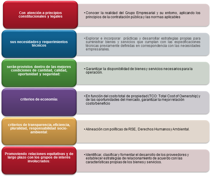 “ESSA declara como su política en materia de adquisición de bienes y servicios que, con atención a los principios constitucionales y legales, sus necesidades y requerimientos técnicos serán provistos dentro de las mejores condiciones de cantidad, calidad, oportunidad y seguridad. Los procesos de contratación se adelantarán con criterios de transparencia, eficiencia, pluralidad, responsabilidad socio-ambiental, economía, entre otros, promoviendo relaciones equitativas y de largo plazo con los grupos de interés involucrados”.